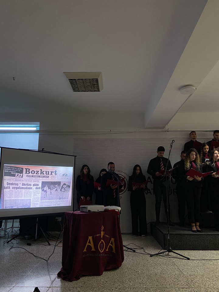 Akademi öğrencilerimizden Şamil Sezer Ateş tarafından günün anlam ve önemini belirten konuşma yapıldı. Hazırlanan “Kıbrıs’ım” adlı oratoryoda solo şiir seslendirmelerinde Aslı Bahçeci, Aygül Öz ve Arda Şanlıdağ’ın yorumlarıyla; onlara müzik öğretmenimiz Sayın Dr. Umut Albayrak yönetiminde eşlik eden Sınıf Öğretmenliği 2. sınıf 3. grup öğrencilerimizin seslendirdiği “Yiğidim Aslanım” adlı türküyle duygulu anlar yaşandı.