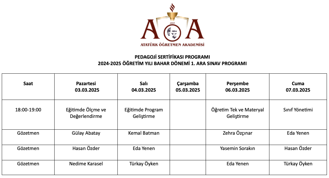 Pedagojik Formasyon Eğitimi Sertifika Programı 2024-2025 Öğretim Yılı Bahar Dönemi 1. Ara Sınav Programı