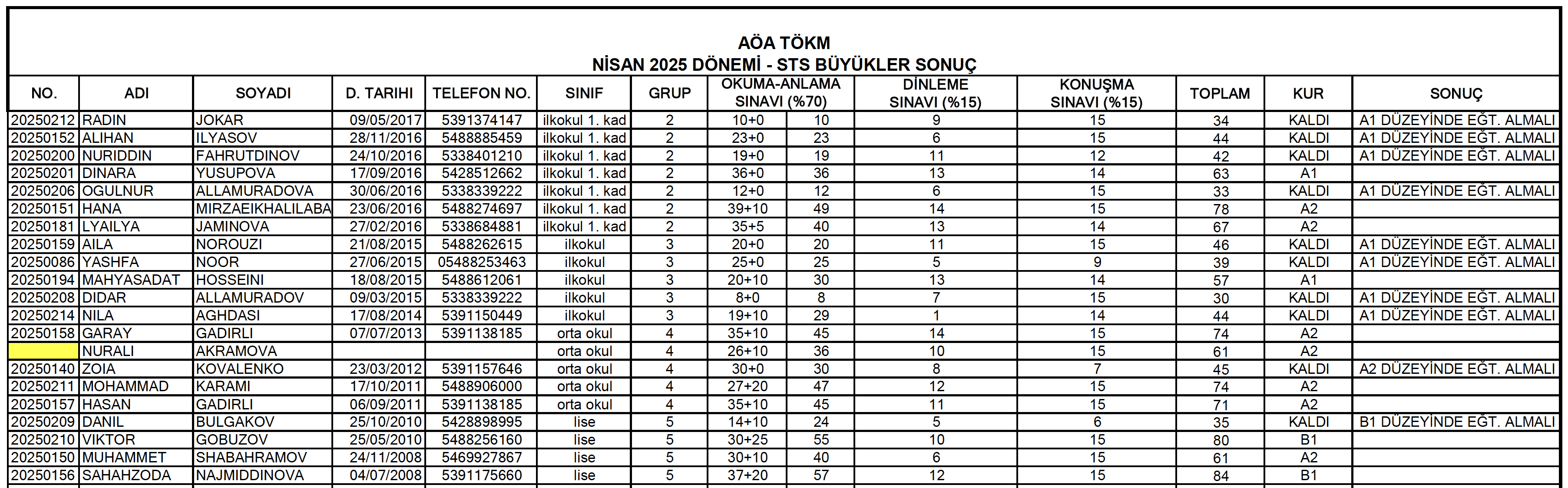 TÖKM Nisan 2025 STS Sonuçları Küçükler